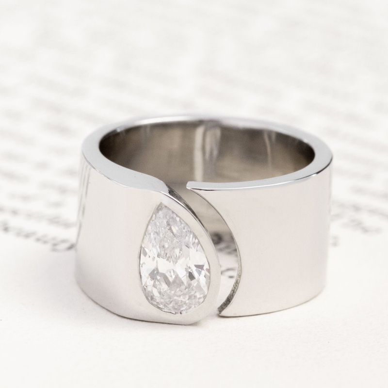 The pear cut diamond is antique – charming, chunky, icy-white face up and 100% eye-clean. Unlike our other cigar bands, this one was set at an angle for a touch of whimsy!