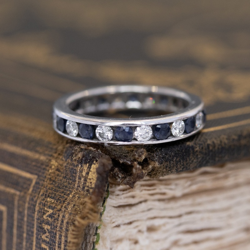 This sapphire and diamond eternity band from Tiffany & Co., part of their “Legacy” collection, is an absolute dream! The channel set, alternating gemstones offer not only the dreamy color contrast of sapphires and diamonds, but also big sparkle! Wed love to see this in a stack of bands, or perhaps snuggled up to a solitaire.
