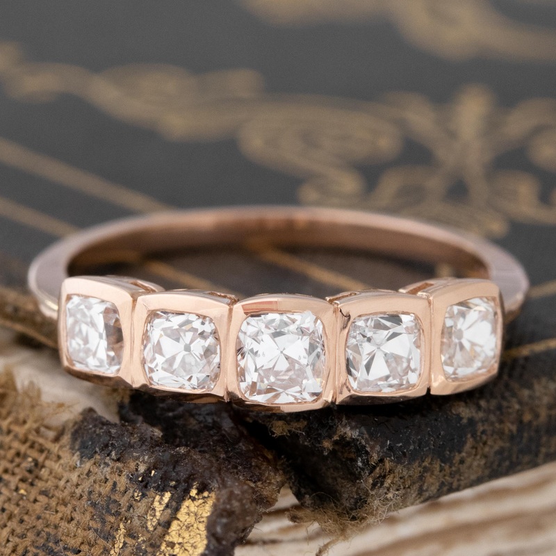 Five chunky old mine cut diamonds, set in cushion shaped bezels and the end result is both sleek yet contemporary but still imbued with that indescribable vintage feel. Low set on the finger, the band is perfect for stacking, as well as matching with an engagement ring. Gorgeous lines with this band!