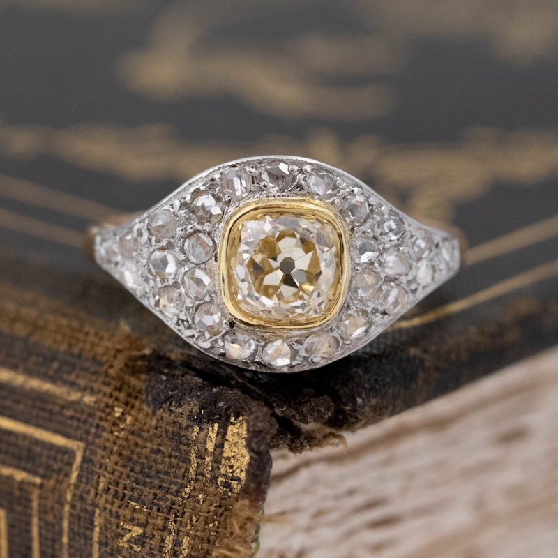 A ring with so much personality to it, plus that gorgeous pop of color! The central old mine cut diamond has that super saturated, sunny color to it and is set amidst glittering rose cut diamonds. Low set on the finger, it’s such a fine example of the craftsmanship of the era.