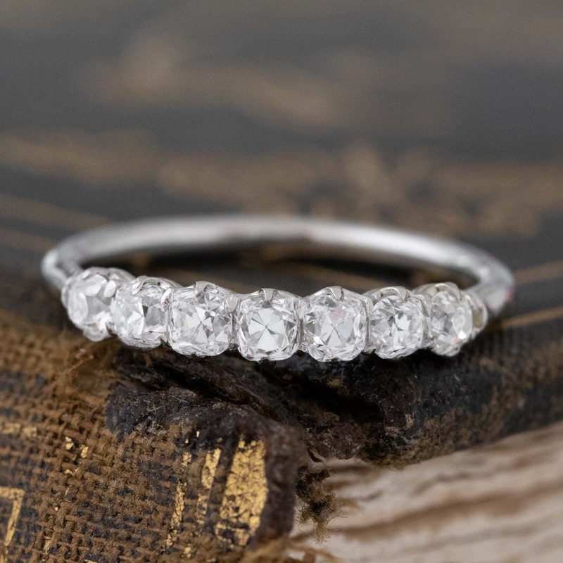 Modeled after antique diamond half-hoop bands from the Georgian and Victorian eras, this 7-stone band is set with chunky and charming old mine cut diamonds in a simple setting with swoopy, airy gallery details. The diamonds are bright and sparkly, twinkly and sparking brightly – so beautiful and elegant on the finger. This is the perfect size for those wanting something smaller and more delicate in scale.
