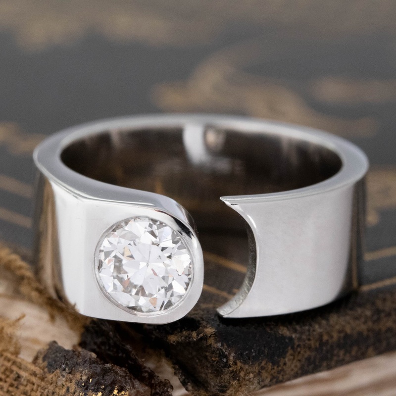 Part of our latest “Melrose” collection of settings – these are cigar band inspired but with an open notch to truly enhance and showcase the silhouette of the diamond. The lines are elegant and clean, with a nod to architectural lines. Bold on the finger, and statetement-making.