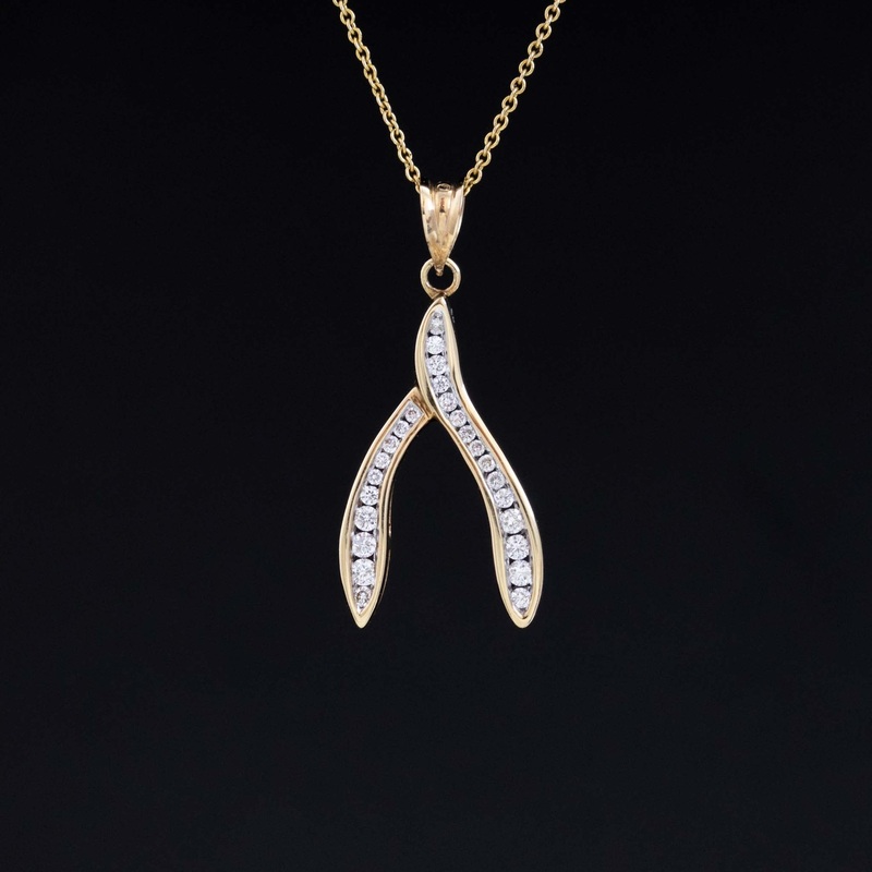 If youre looking for your next diamond and gold talisman – we may have found her for you. A popular custom with these guys in real life is to have one person hold each end and then pull them apart. Whoever gets the longer piece of the bone gets to make a wish. When wishbones are represented as a whole (rather than two split halves), they become a symbol of fortune and potential, even good luck. Theyre a wonderful token to keep on oneself, or to wish onto another loved one.